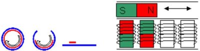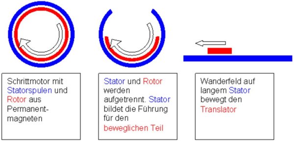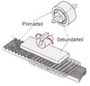 Der Ständer der rotatorischen Asynchronmaschine wird zum Primärteil des linearen Asynchronmotors. Gleichzeitig wandelt sich der Läufer der Asynchron-Rotationsmaschine in den Sekundärteil des Asynchron-Linearmotors.