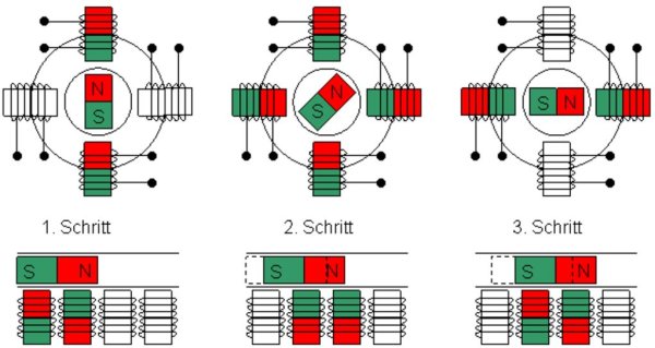 Diese Funktionsweise kann in einem vereinfachten Modell veranschaulicht werden: Der Translator (auch Glider oder Slider genannt) bestehe aus einem oder mehreren Permanentmagneten. Der Stator besitzt in diesem Beispiel einseitig vier Spulen. Was zum Beispiel in einem Schrittmotor zu einer Rotationsbewegung führt, wird im Linearmotor linear umgesetzt.