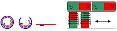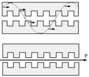 Um eine elektromagnetische Kraftwirkung zu erzielen, muss in den Luftspalt zwischen den beiden Primärteilen ein elektrisch leitfähiger Stoff, das Sekundärteil, eingebracht werden. Das Wanderfeld durchdringt das Sekundärteil und induziert eine Spannung. Bedingt durch diese Spannung fließt im Sekundärteil ein Wirbelstrom, der mit dem Magnetfeld interagiert und eine Lorentzkraft F erzeugt.