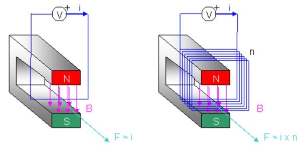 Die Variable a bezeichnet den Winkel zwischen den Vektoren des magnetischen Feldes und des Drahtes (in diesem Beispiel sin(90°)=1). Dieses Grundgesetz wird verstärkt, indem statt einem Draht eine ganze Spule mit n Windungen ausgenutzt wird. Jede Windung der Spule wird nun vom magnetischen Feld durchflossen und verstärkt somit die Kraft F um das n-fache.