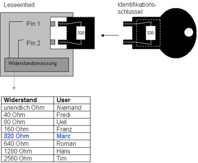 Bei dieser Bauform ist ein elektrischer Widerstand das Unterscheidungsmerkmal der User. Jeder Identifikationsschlüssel hat einen bestimmten Widerstandswert. Beim Identifikationsprozess wird über elektrische Kontakte dieser Widerstandswert gemessen. In einer User-Tabelle ist der User dem Widerstandswert zugeordnet.