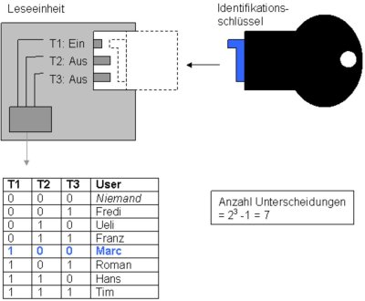 Im Endeffekt geht es bei diesem Prinzip darum, je nach Schlüssel oder User, eine bestimmte Ein-Aus-Kombination der Bits zu erzeugen. Dies kann beispielsweise auch durch magnetische oder optische Taster erfolgen. Letztere könnten auch als berührungslose Identifikationsprinzipien klassifiziert werden.