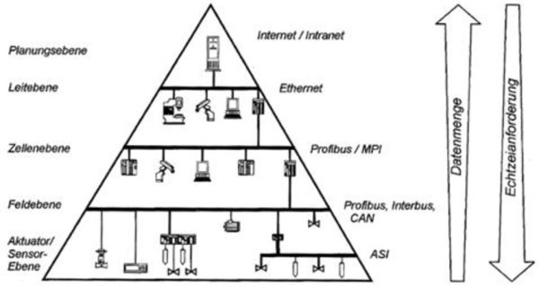| Feldebene | Hier werden zeitkritische Aufgaben ausgeführt. Die Feldebene besteht aus programmierbaren Geräten wie SPS oder Industrierechner. Daten von der Aktor-/Sensorebene werden ausgewertet. | CAN, Profibus |