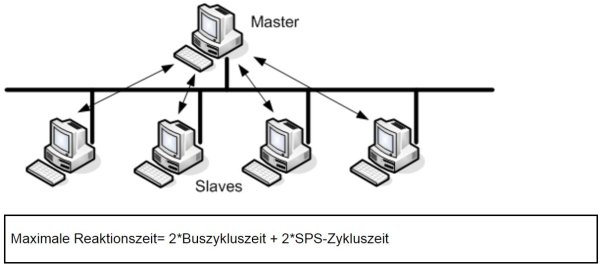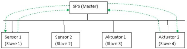 Der Master stellt in der Regel zyklisch die Verbindung zu jedem Slave her (polling). Damit ist im Master immer ein aktuelles Abbild des zu steuernden Prozesses abgelegt.