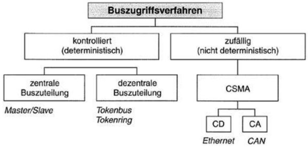 Fast alle Netzwerktopologien setzten voraus, dass zu einem bestimmten Zeitpunkt nur ein Sender auf das gemeinsame Trägermedium zugreift. Im folgenden sollen verschiedene Möglichkeiten, diesen Buszugriff zu regeln, vorgestellt werden. Dabei unterscheidet man, wie in der folgenden Abbildung dargestellt, zwischen kontrollierten und zufälligen Buszugriffsverfahren.