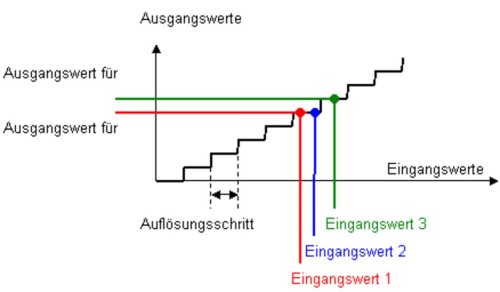 Auflösung: Die Auflösung eines Messsystems gibt an, wie nahe zwei Eingangswerte beieinander liegen können, so dass sie im Ausgangssignal sicher immer als zwei unterschiedliche Werte wahrgenommen werden können. Die Auflösung wird in Prozent vom Messbereich (analog) oder in Bit (digital) angegeben. Bei Sensoren mit analogem Signalausgang (eine Spannung) wird die Auflösung letztlich durch die Amplitude des Rauschens (Störung) bestimmt. Bei Sensoren mit digitalem Signalausgang wird die Auflösung vom ADC (Analog-Digital-Converter) bestimmt.
