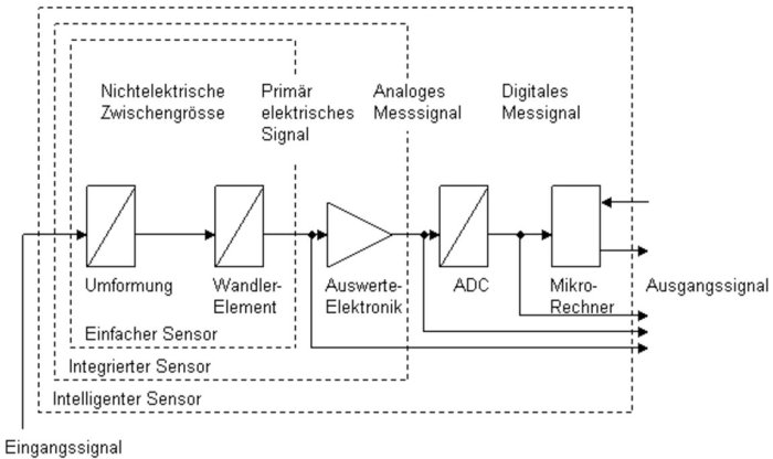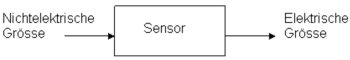 Sensoren sind Elemente, die ein nichtelektrisches Eingangssignal (nichtelektrische Grösse) in ein elektrisches Ausgangssignal für die weitere Verwertung umwandeln. Eine nichtelektrische Grösse kann beispielsweise eine Geschwindigkeit, eine Temperatur oder das Vorhandensein eines Objektes sein.