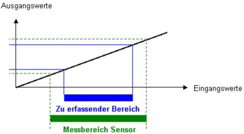 Messbereich: Der Messbereich ist der Bereich der Eingangswerte, der auf den zulässigen Bereich der Ausgangswerte abgebildet werden kann. In der Praxis wird der Messbereich des Sensors immer grösser als der zu erfassende Bereich gewählt.
