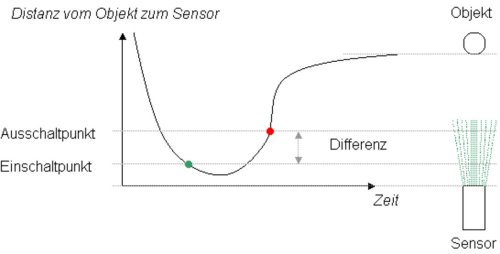 Hysteresefehler: Hysteresefehler treten meistens bei Sensoren mit magnetischen oder piezoelektrischen Messprinzipien auf. Hystereseerscheinungen sind physikalisch immer mit Speicherung oder Umwandlung von Energie verbunden. Bei einem Näherungsschalter äussert sich die Hysterese mit einer Differenz zwischen dem Einschalt- und dem Ausschaltpunkt.
