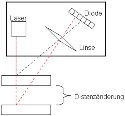 Ein weiteres Auswerteprinzip für die Abstandsmessung ist die Triangulation. Der Sensor besteht hierbei aus einer Laserlichtquelle, eines Objektivs und einer Photodiodenzeile (aneinander gereihte Dioden, vergleichbar mit dem Bildsensor einer Digitalkamera). Das Laserlicht wird vom zu messenden Objekt durch die Objektivlinse in einem bestimmten Winkel zur Diode geleitet. Erfolgt eine Abstandsänderung des Messobjektes, so ändert auch der Einfallswinkel des Laserlichtstrahls. Dies führt dazu, dass der auftreffende Lichtpunkt entlang der Photodiodenzeile seine Position ändert. Dies gibt Rückschluss auf die Distanz, oder Distanzänderung des Objektes. 1um bis 100m.