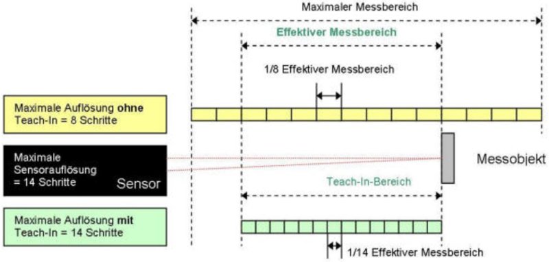 Bei optischen Abstandssensoren mit einer Teach-In-Funktion muss folgendes beachtet werden. Der effektiv zu messende Bereich kann innerhalb des maximalen Messbereichs mit der Teach-In-Funktion begrenzt werden. Die Analogausgabe hat ihren vollen Hub und Auflösung innerhalb dieses geteachten Bereichs. Auflösung und Linearität verändern sich bei Veränderungen des Messbereichs. Je näher der Fernpunkt des Messbereichs am Sensor liegt, desto besser ist die Auflösung.