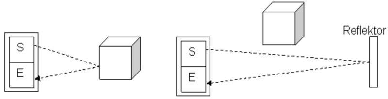 Bei der Reflektionslichtschranke wird der Sender und Empfänger im gleichen Gehäuse untergebracht. Auch hier wird vom Sender ein Lichtstrahl ausgesendet. Dieser kann an einer reflektierenden Oberfläche eines Objektes zum Empfänger reflektiert werden. Bei nichtreflektierenden Oberflächen kann ein Reflektor Abhilfe leisten. Dabei unterbricht das Objekt den Lichtstrahl.