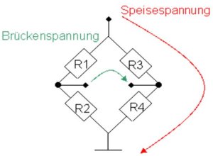 Angenommen R2 sei ein DMS und die restlichen feste Widerstände. Wenn das untenstehende Widerstandsverhältnis herrscht, ist die Brückenspannung NULL, sprich keine Ausdehnung. [ {R1 \over R2}={R3 \over R4} ]
