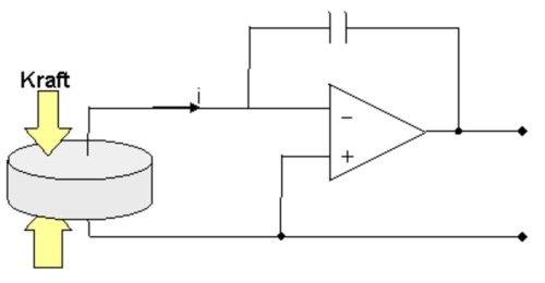 Schaltungsarten Nach einer Deformation des Kristals enstehen keine weiteren Elektronen, die über einen externen Widerstand zu einem Stromfluss führen würden. In diesem Moment stellt das Piezoelement eine sehr hochohmige Spannungsquelle dar, die entsprechend hochohmig abgegriffen werden muss. Für die Auswertung wird empholen eine Ladungsverstärkerschaltung (Stromintegrator) einzusetzen.