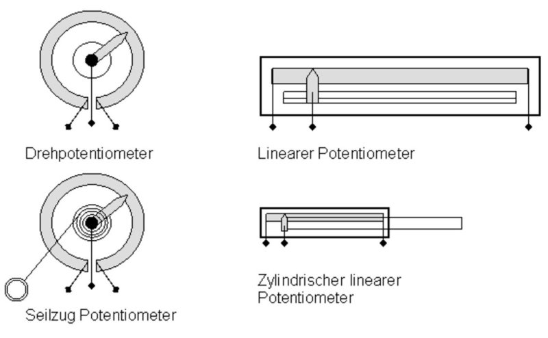 Potentiometrische Sensoren gibt es in zwei Bauformen. Mit dem Drehpotentiometer können Winkelstellungen gemessen werden. Mit einem linearen Potentiometer wird die lineare Position eines Objektes erfasst.