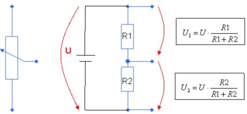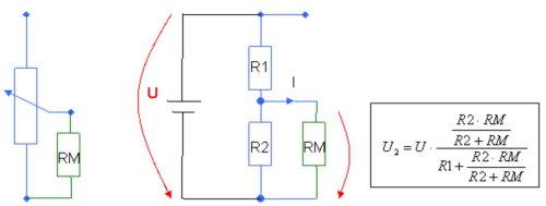 Der potentiometrische Sensor ist die klassische Umsetzung eines Spannungsteilers. Die Spannungsteilung erfolgt über einen Schleifkontakt, der über einer Widerstandsbahn geführt wird. Beim reinen Spannungsteiler wird die Spannung üblicherweise anhand zweier Widerstände geteilt. Hier das elektrische Schaltbild des unbelasteten Spannungsteilers: